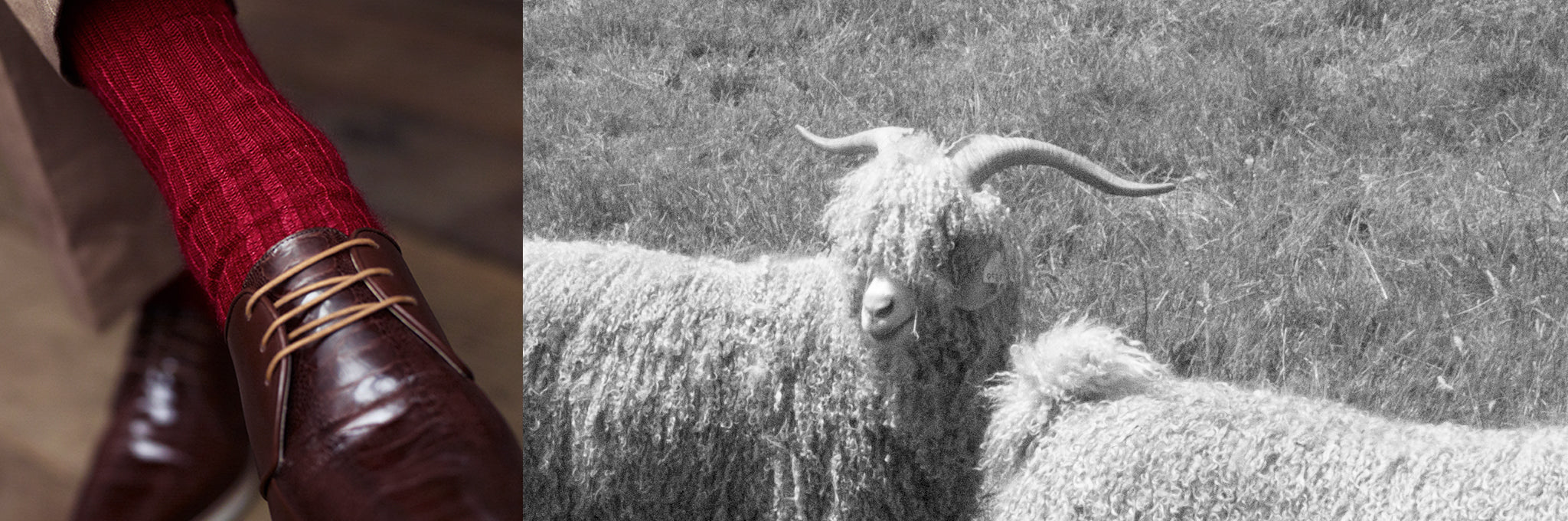 • Mohair yarn from the fleeces of Angora goats, spun in Cornwall, socks knitted in Leicester, hand-dyed in Devon, England.